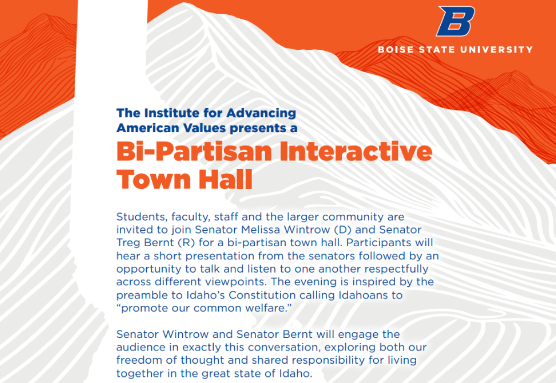 Please join me and Sen Bernt for an exciting interactive program hosted by Boise State’s Institute for Advancing American Values. The event will center on table conversations where attendees will explore what it truly means to advance the “common welfare” in our state—a foundational value found in the preamble and throughout Idaho’s Constitution. The event includes a short presentation followed by facilitated conversation across different viewpoints, inspired by Idaho’s Constitution and its call to promote “our common welfare.” Event questions can be sent to specialevents@boisestate.edu.